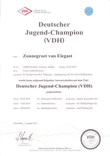 Ibine (Zonnegroet van Elegast) 1 V, JCAC VDH Jugend Frühjahrssiegerin 2014 Gibbs (Zonnekoning van Elegast) SG 1 ------------------------------------------------------------------------------- Gibbs (Zonnekoning van Elegast) 1 excl. JCAC VDH - Jugend Eurosieger 2014